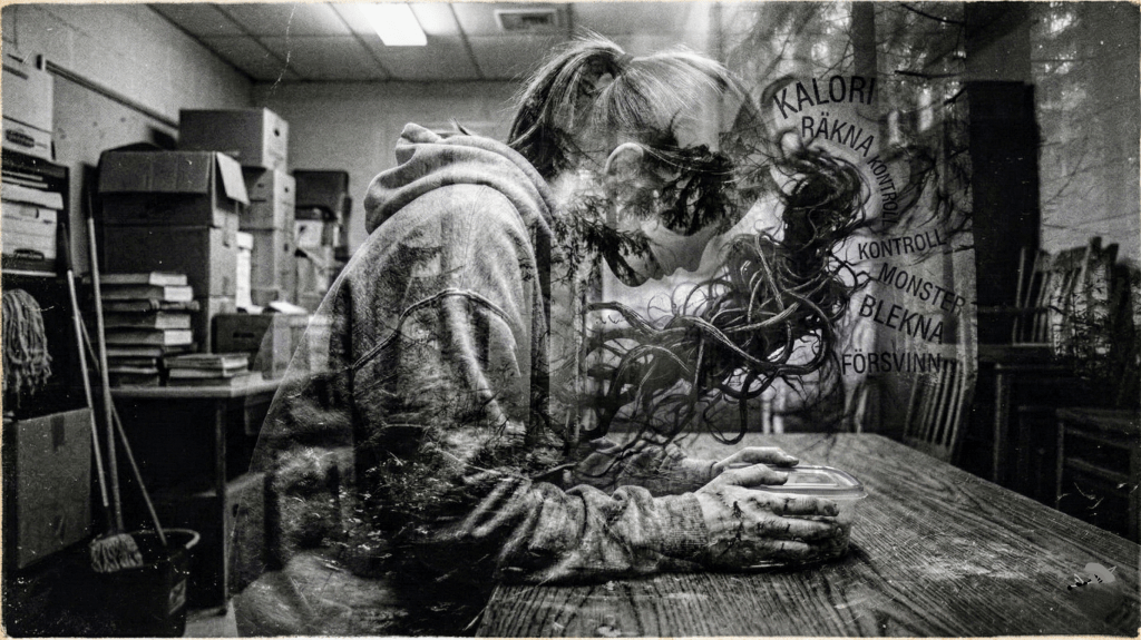 Hon tar gaffeln och börjar peta i maten. Flyttar en tomat en millimeter till vänster. Sedan tillbaka igen. Sekunderna sträcker ut sig. Och de sliter isär mig inifrån. Världen krymper till gaffeln som till slut långsamt börjar sin färd mellan plastlåda och mun. Tuggar långsamt. Som att det kräver all energi hon har.